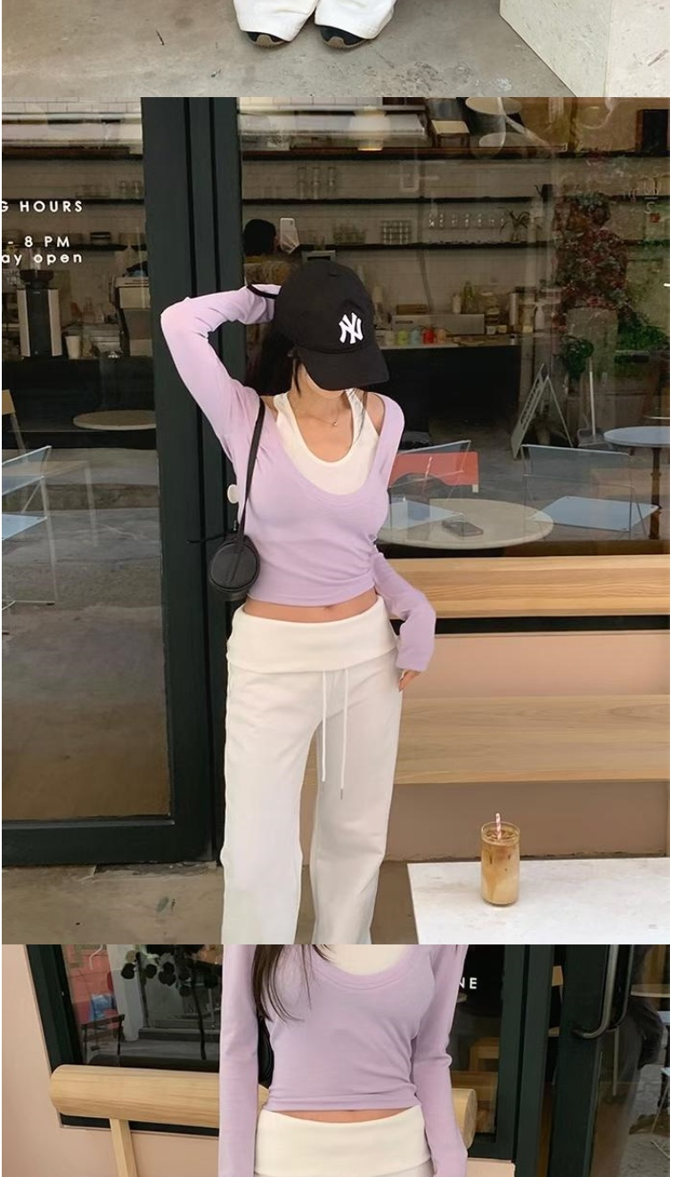 正韓T恤 刺繡拼色長袖T恤FIE1042-創翊韓都現貨