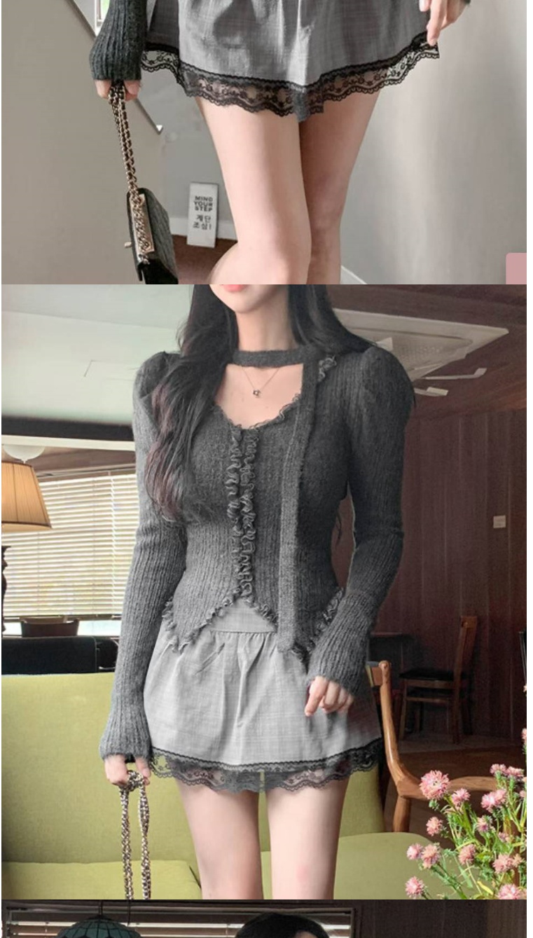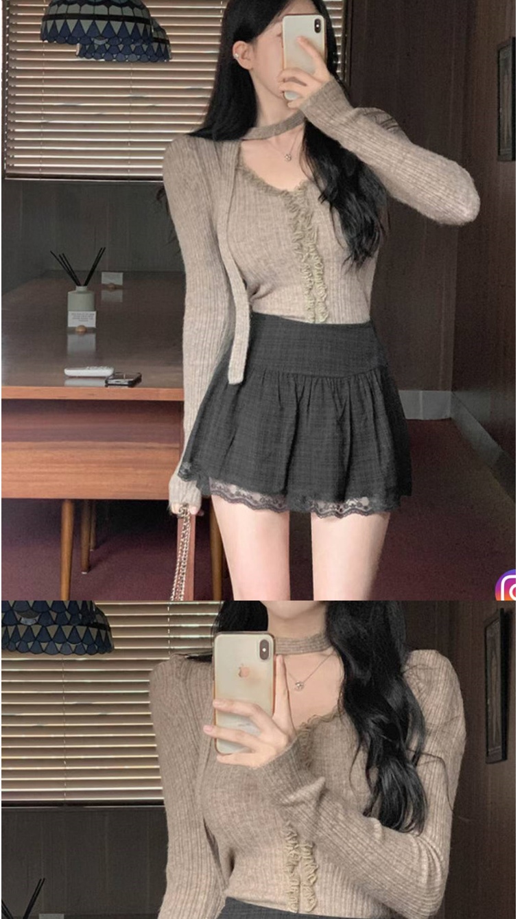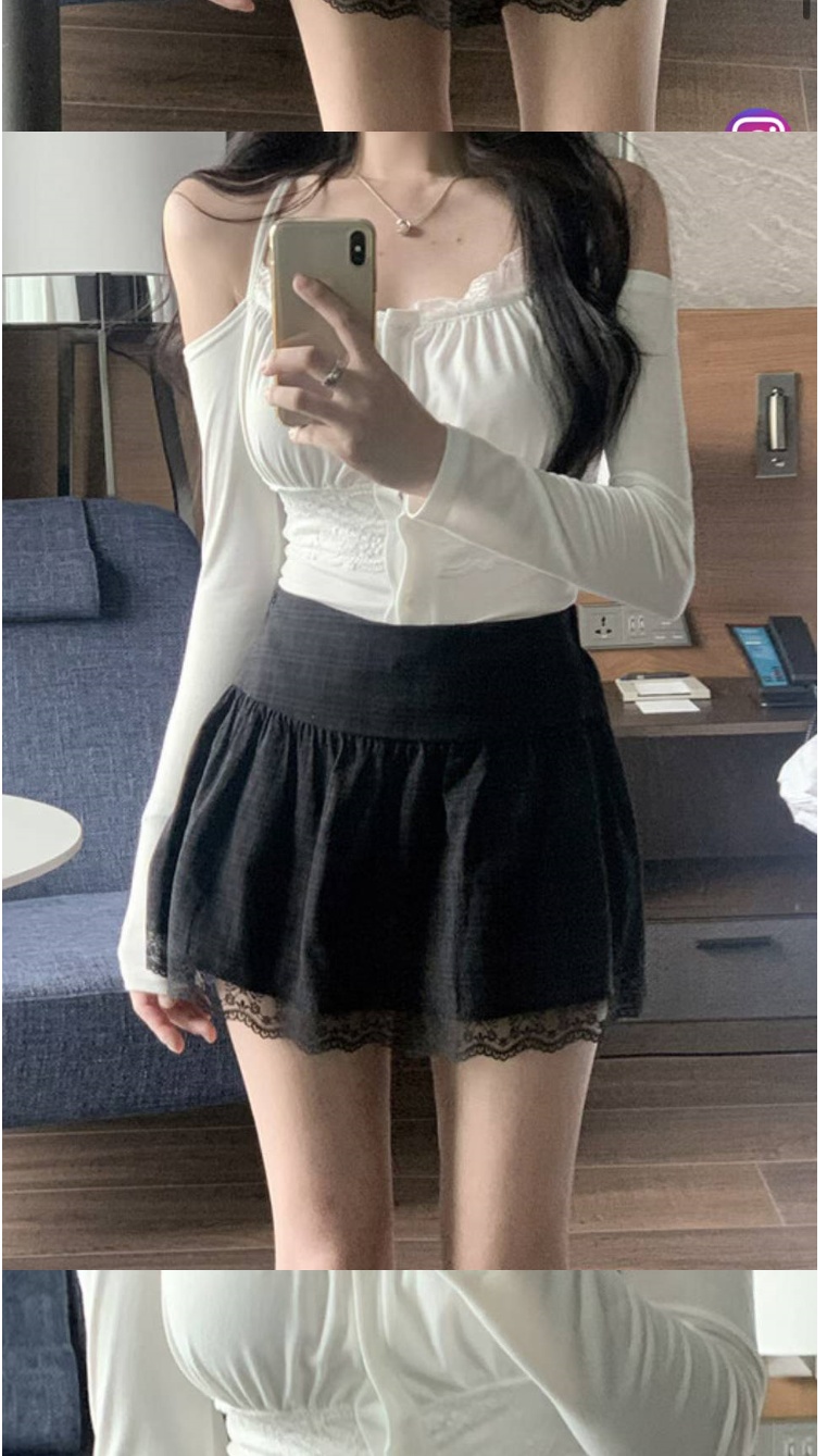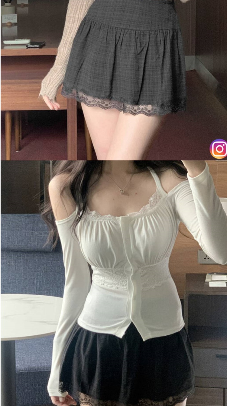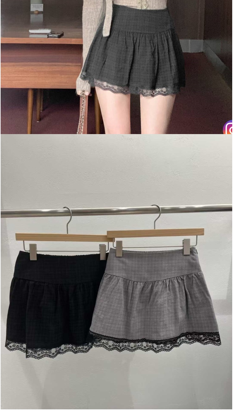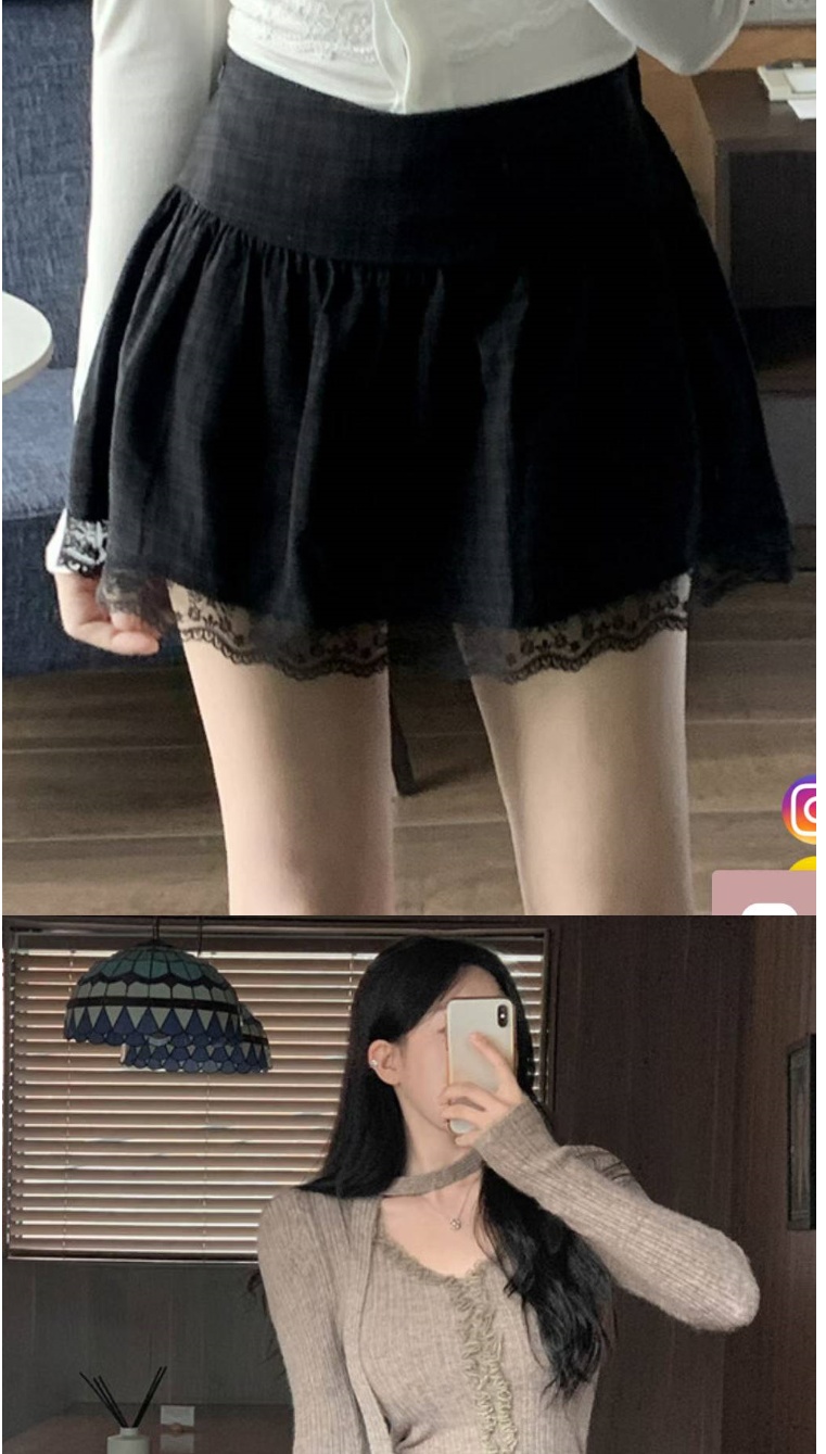 正韓短裙 格紋蕾絲迷你短裙PLE1007-創翊韓都